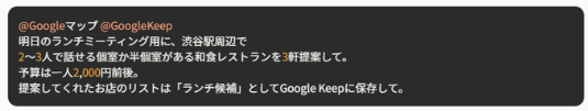 > `「@Googleカレンダー 来週月曜10時にリマインダーをセットして」`