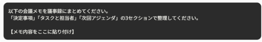 ざっと書いたメモや長い録音テキストを貼り付けるだけで、見やすい議事録に整形してくれます。