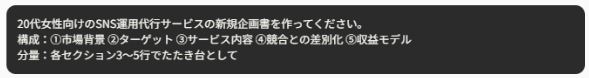 > `「〇〇について報告書を作成して。構成:現状→課題→提案→アクションプラン」`