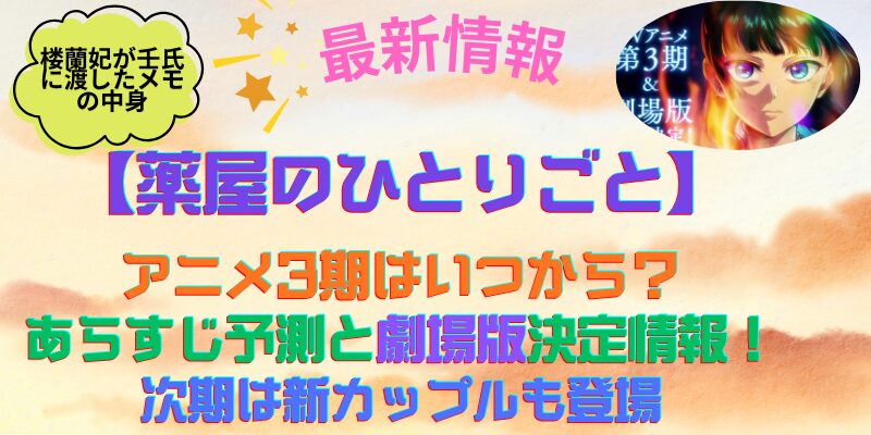 【最新!薬屋のひとりごと】アニメ3期はいつから?ネタバレ予測と劇場版決定情報!次期は新カップルも登場